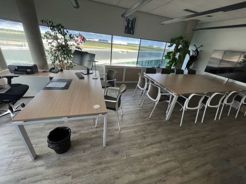 Aménagement d’un bureau astro direction avec desserte, conçu pour les managers et dirigeants à la recherche d'un design sobre et contemporain, Buronomic a décliné la gamme Astro en version Direction. Cette gamme offre un plateau de dimensions généreuses associé à un piétement métal arche valorisant et robuste - coloris présenté chêne fil piétement blanc ainsi que sa table de réunion 12 personnes.