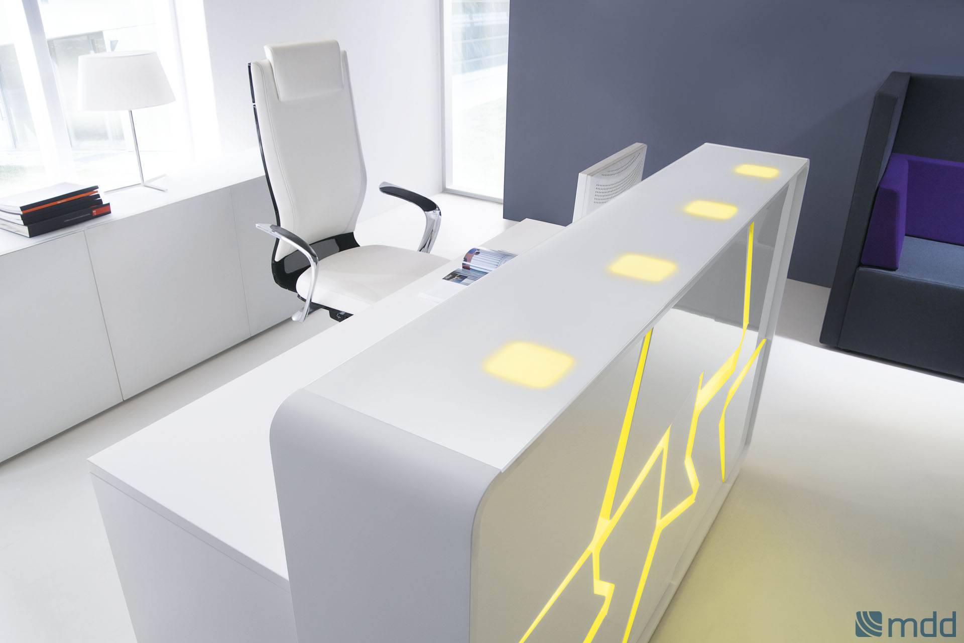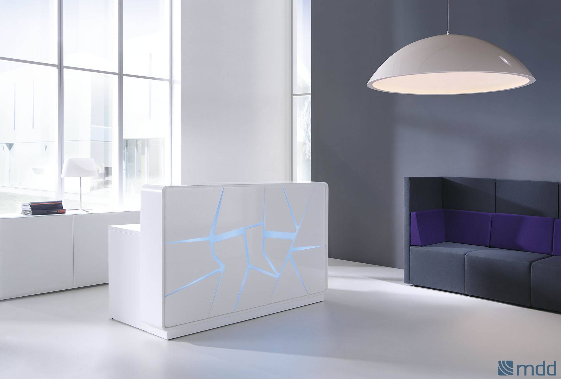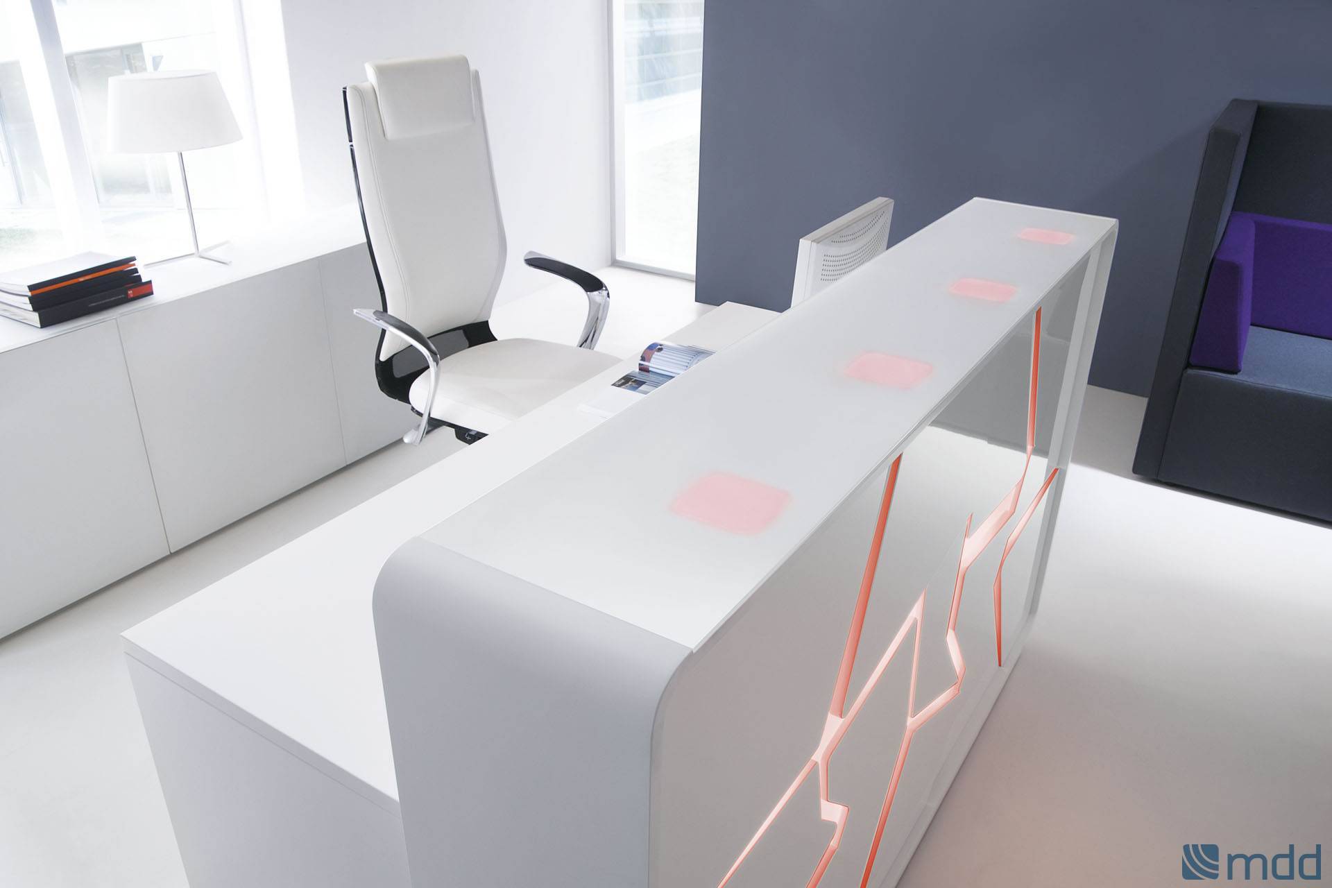 Coventry spécialiste du mobilier de bureau sur Bordeaux propose L'ACCUEIL ARCTIC Plan de travail en mélamine top de dessus en verre de 4mm façade MDF en laque blanc brillant. Dimension largeur 1800 prof. 900 hauteur 1100 - Tubes lumineux blancs