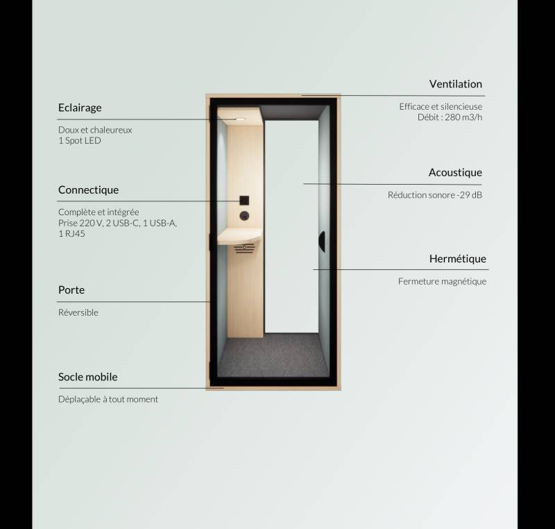 Conçues pour s'intégrer harmonieusement dans tout type d'environnement professionnel, ces cabines innovantes combinent performance acoustique et esthétique. Elles permettent aux utilisateurs de profiter d'un espaces privé et silencieux, idéal pour une Visio, une réunion entre collaborateurs, ou un bref moment de relaxation.