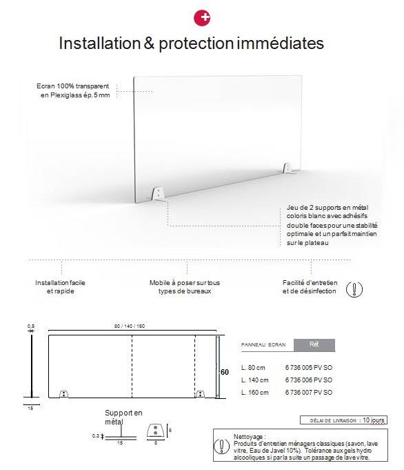 Ces barrières de protection en plexiglass, transparentes, équilibrées et adaptables sur plusieurs types de surfaces sont très faciles à placer sur des banques d'accueil, bureaux, tables... De plus, ces écrans sont 100% recyclables et faciles à nettoyer.