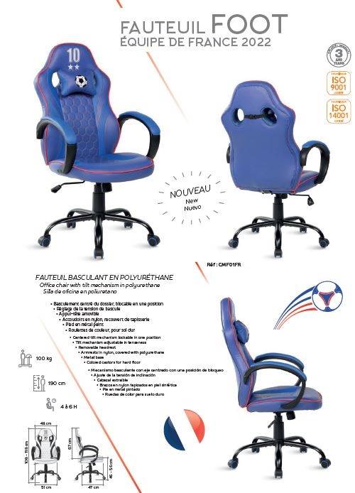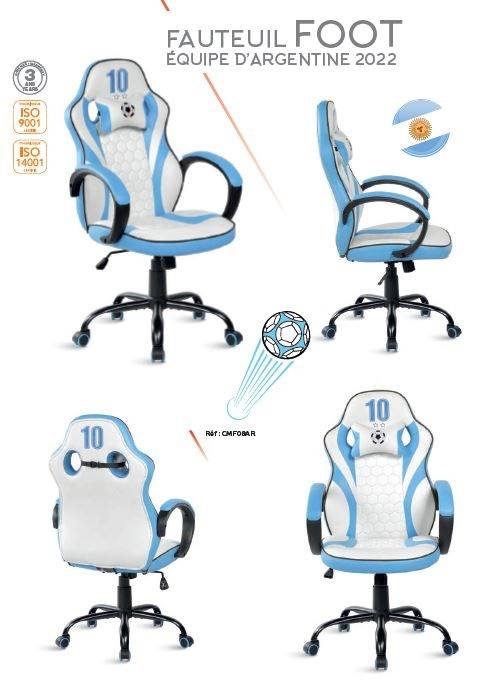 Pour les joueurs de jeu vidéo "GAMER" pour de longues nuits ou occasionnellement. Pour des professionnels de logiciels ou création de site internet.Choisissez votre fauteuil suivant vos préférences avec bluethooth et USB. Fauteuil Ergonomique avec mécanisme synchrone, réglage de tension de bascule, accoudoir 3D, coussin pour le soutien lombaires, appui-tête réglable en hauteur et inclinaison à l'horizontal pour certain modèles. Au design futuriste pour certain ou version FOOT pour d'autres au choix de son équipe favorite: ESPAGNE, ANGLETERRE, FRANCE, PORTUGAL, ITALIE, ALLEMAGNE, BELGIQUE, BRESIL et bien d'autres.... IRRESSISTIBLE!!! Garantie 2 ans voir 3 ans sur certain fauteuils.