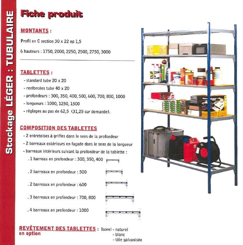 Existe en plusieurs dimensions et hauteur et respecte les charges admissibles par tablettes. NOUS CONSULTER POUR DEVIS GRATUIT.